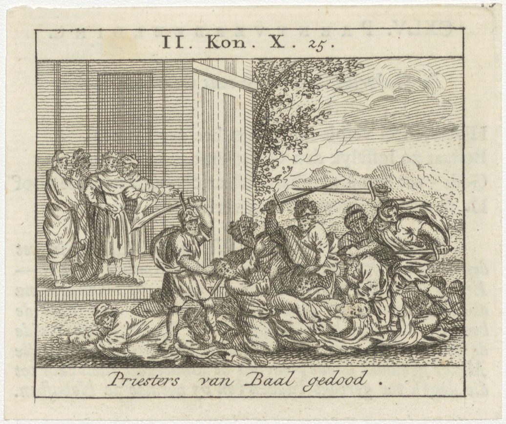 Bijbelscènes (serie): Priesters van Baal gedood (2 Kon.10:25), kz. boekdruk niet corresponderend met voorzijde;