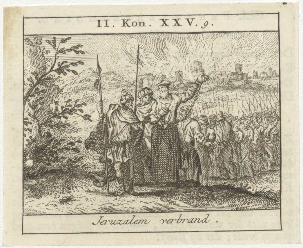 Bijbelscènes (serie): Jeruzalem verbrand (2 Kon.25:9), kz. boekdruk niet corresponderend met voorzijde;