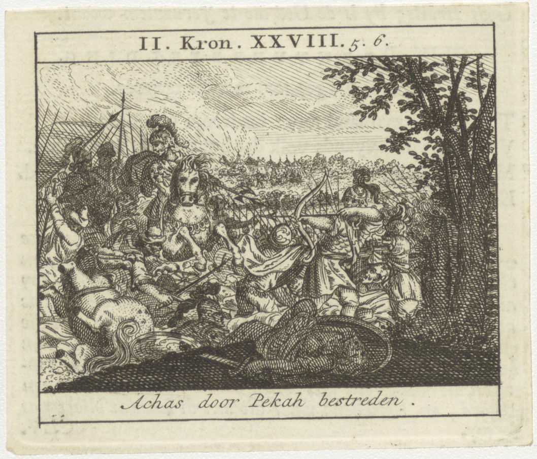 Bijbelscènes (serie): Achas door Pekah bestreden (2 Kron.28:5-6), kz. boekdruk niet corresponderend met voorzijde;