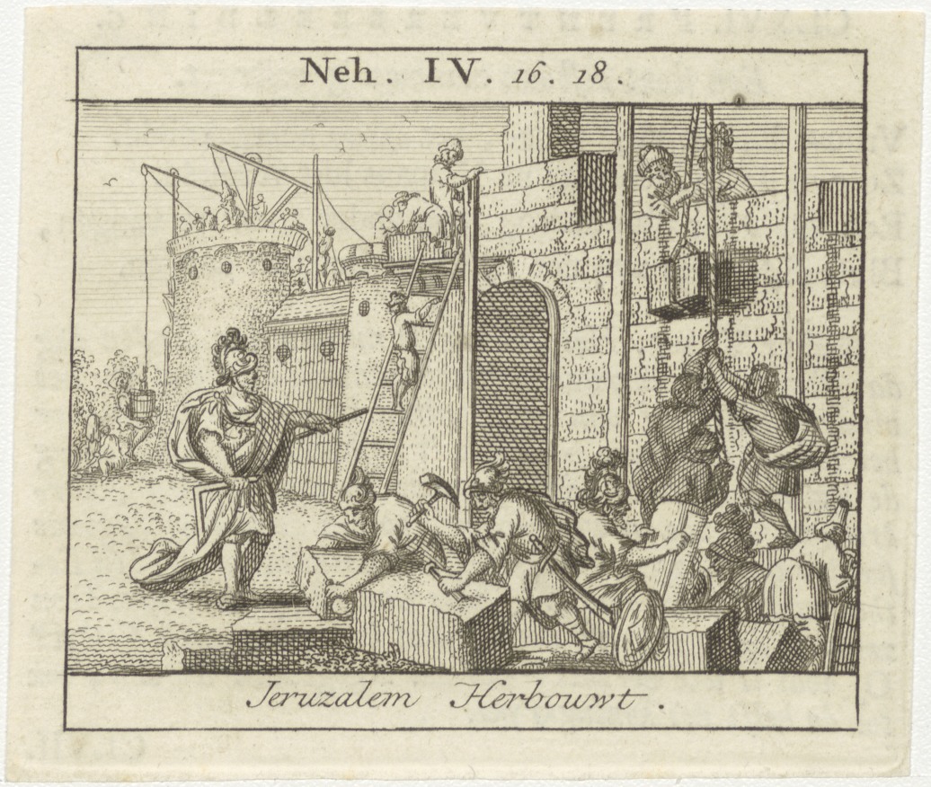 Bijbelscènes (serie): Jeruzalem herbouwt (Neh.4:16-18), kz. boekdruk niet corresponderend met voorzijde;