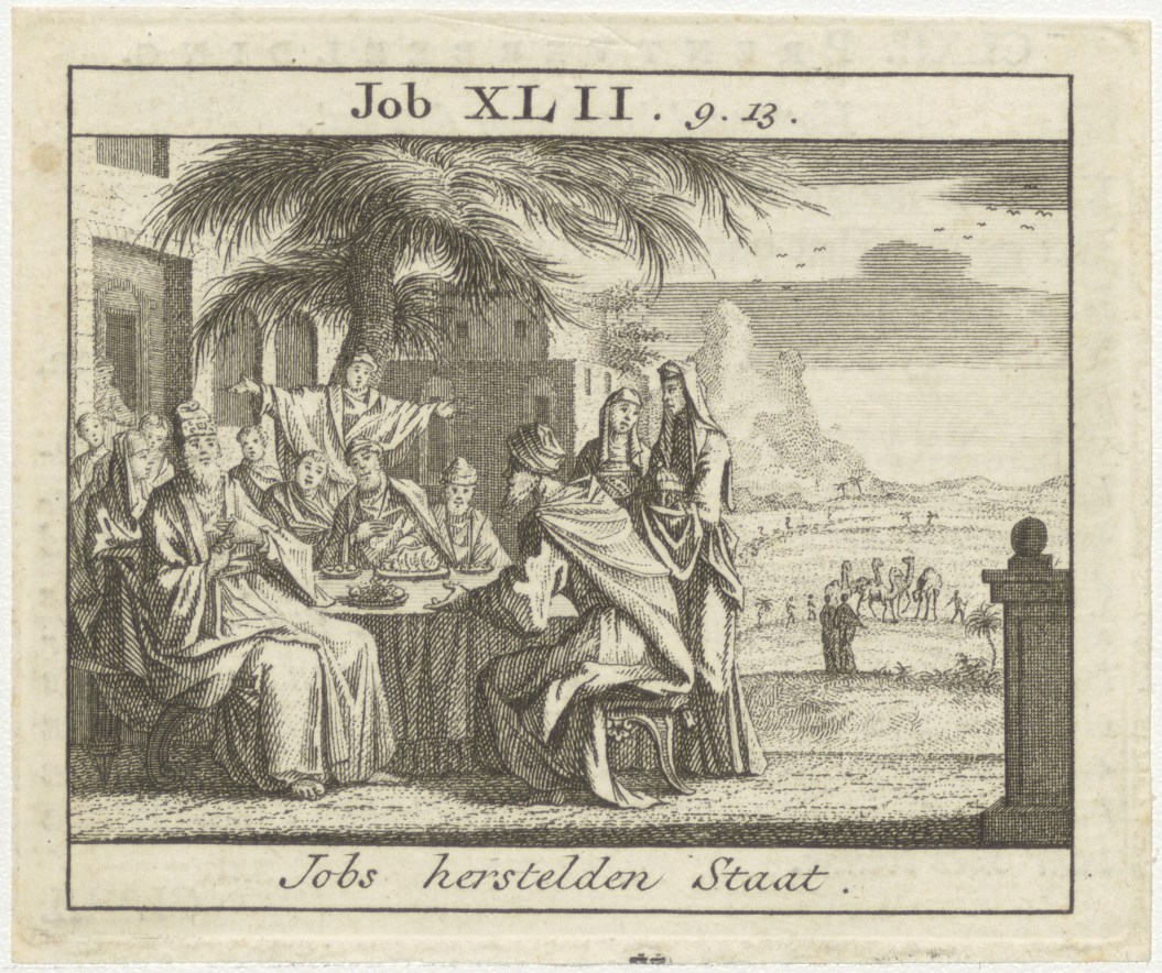 Bijbelscènes (serie): Jobs herstelden staat (Job 42:9-13), kz. boekdruk niet corresponderend met voorzijde;
