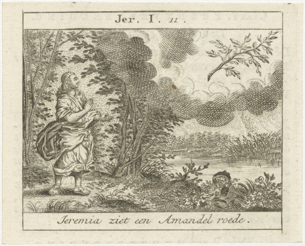 Bijbelscènes (serie): Jeremia ziet een Amandel roede (Jer.1:11), kz. boekdruk niet corresponderend met voorzijde;