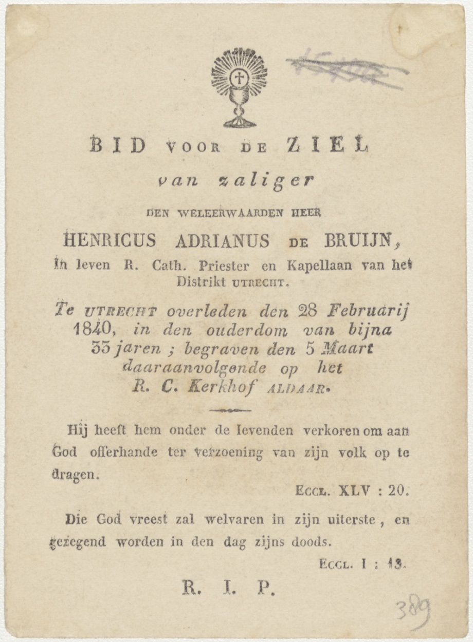 Christus in de Olijvenhof (Hof van Olijven), kz. Religieus;Bid voor ziel Henricus Adrianus de Bruyn (+1840);R.K. Priester en kapellaan;Utrecht