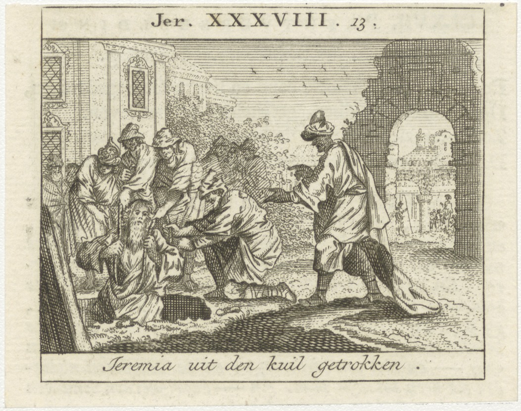 Bijbelscènes (serie): Jeremia uit den kuil getrokken (Jer.38:13), kz. boekdruk niet corresponderend met voorzijde;