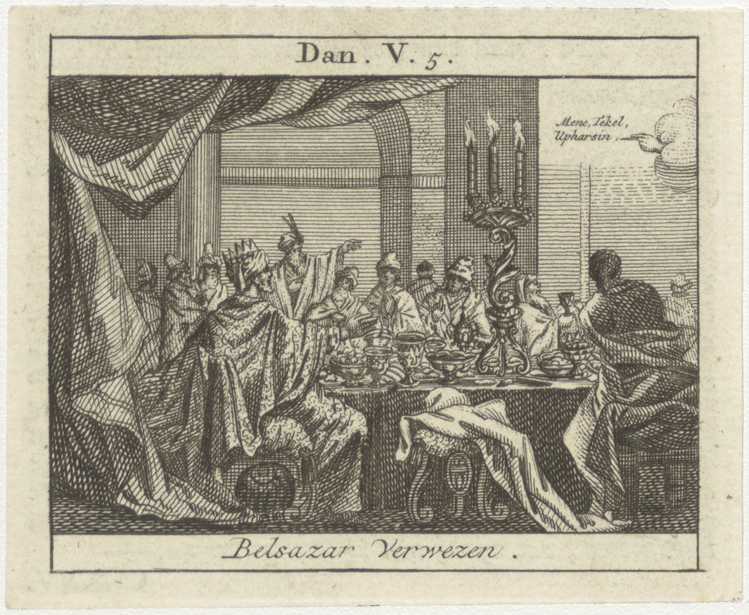 Bijbelscènes (serie): Belsazar verwezen (Dan.5:5), kz. boekdruk niet corresponderend met voorzijde;