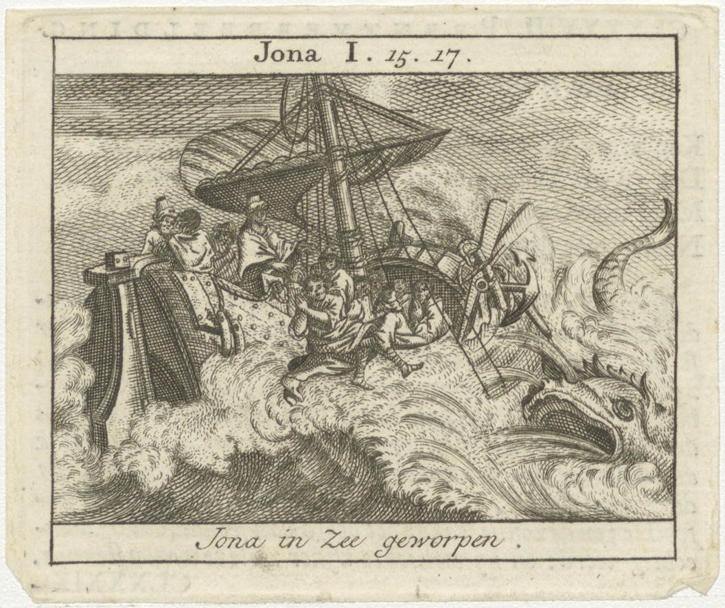 Bijbelscènes (serie): Jona in zee geworpen (Jona 1:15-17), kz. boekdruk niet corresponderend met voorzijde;