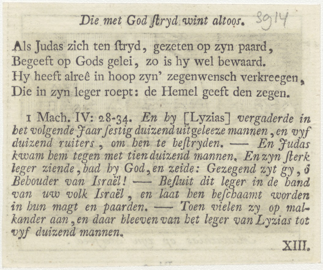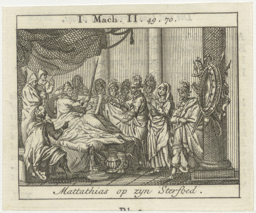 Bijbelscènes (serie): Mattathias op zijn sterfbed (1 Makk.2:49-70), kz. boekdruk niet corresponderend met voorzijde;