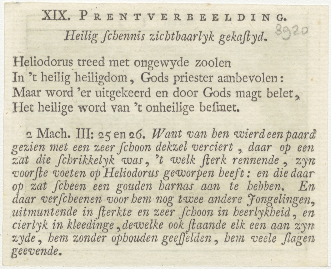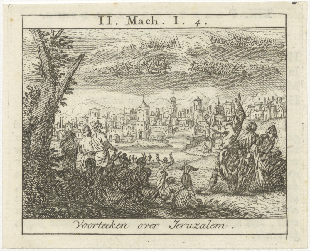 Bijbelscènes (serie): Voorteeken over Jeruzalem (2 Makk.1:4), kz. boekdruk niet corresponderend met voorzijde;