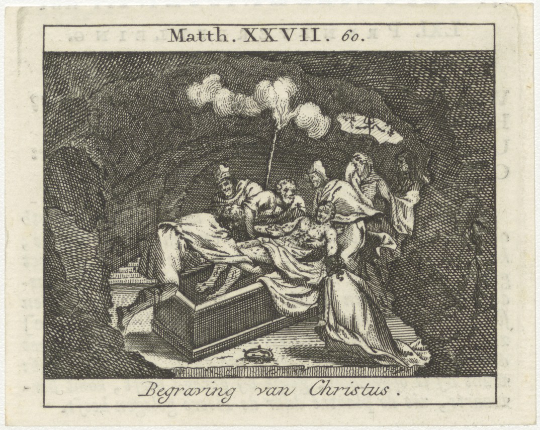 Bijbelscènes (serie): Begraving van Christus (Mat.27:60), kz. boekdruk niet corresponderend met voorzijde;