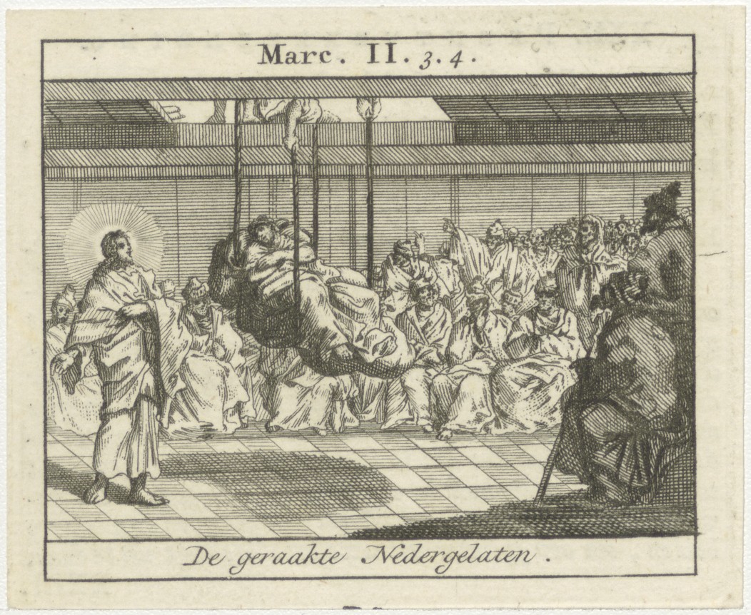 Bijbelscènes (serie): De geraakte nedergelaten (Mar.2:3-4), kz. boekdruk niet corresponderend met voorzijde;