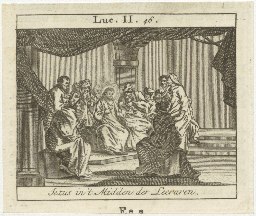 Bijbelscènes (serie): Jezus in 't midden der leeraren (Luc.2:46), kz. boekdruk niet corresponderend met voorzijde;