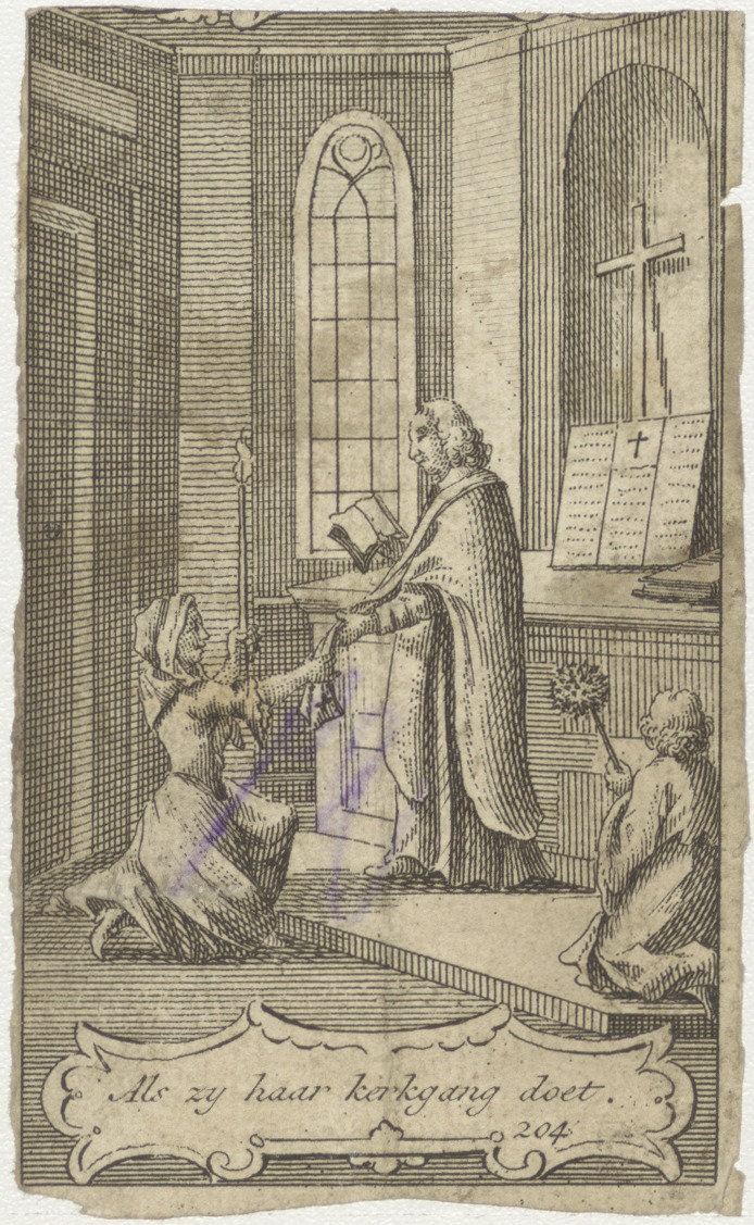 Eerste kerkgang der vrouw na geboorte van kind, een vrouw geknield voor altaar met kaars in hand