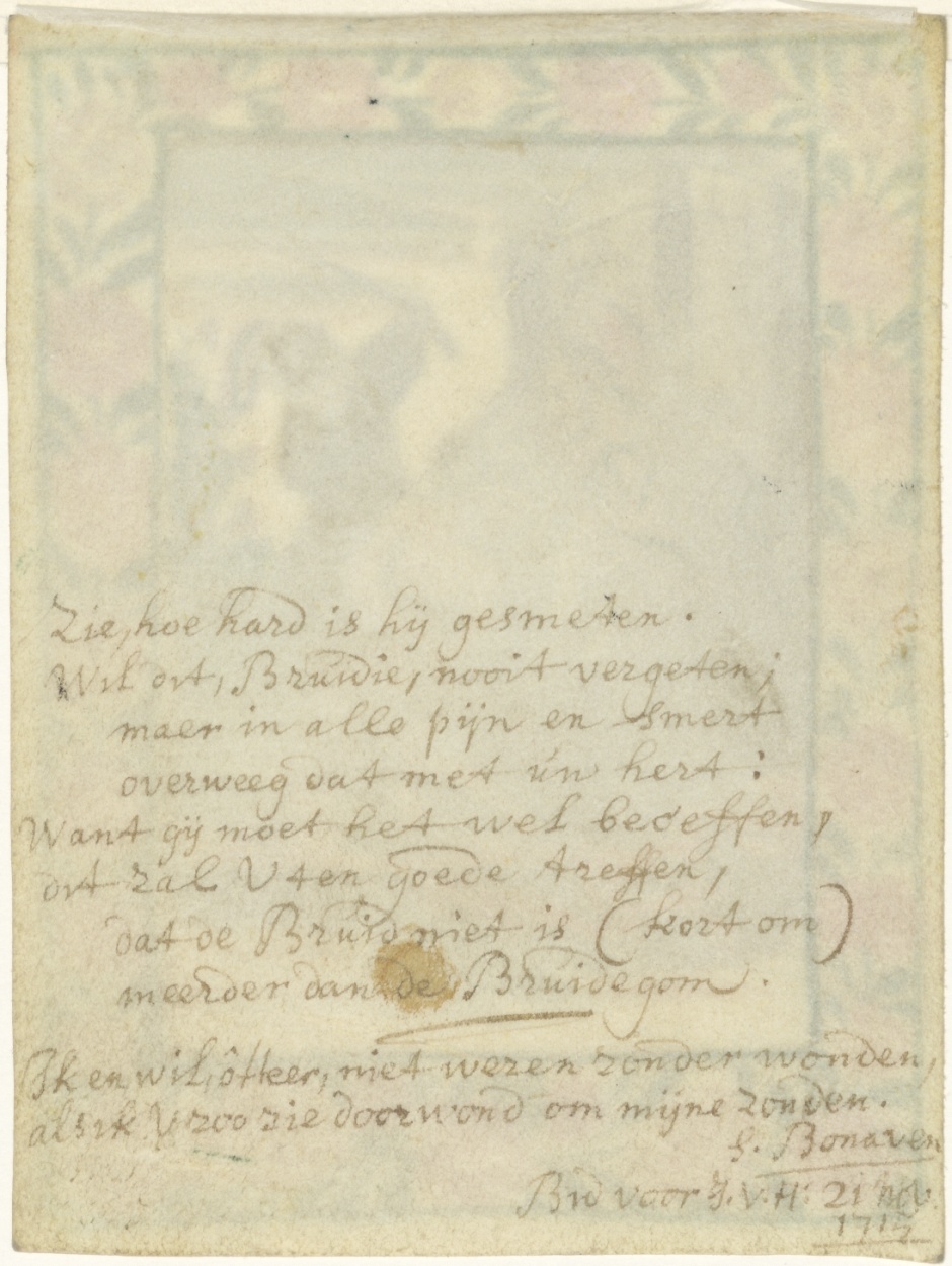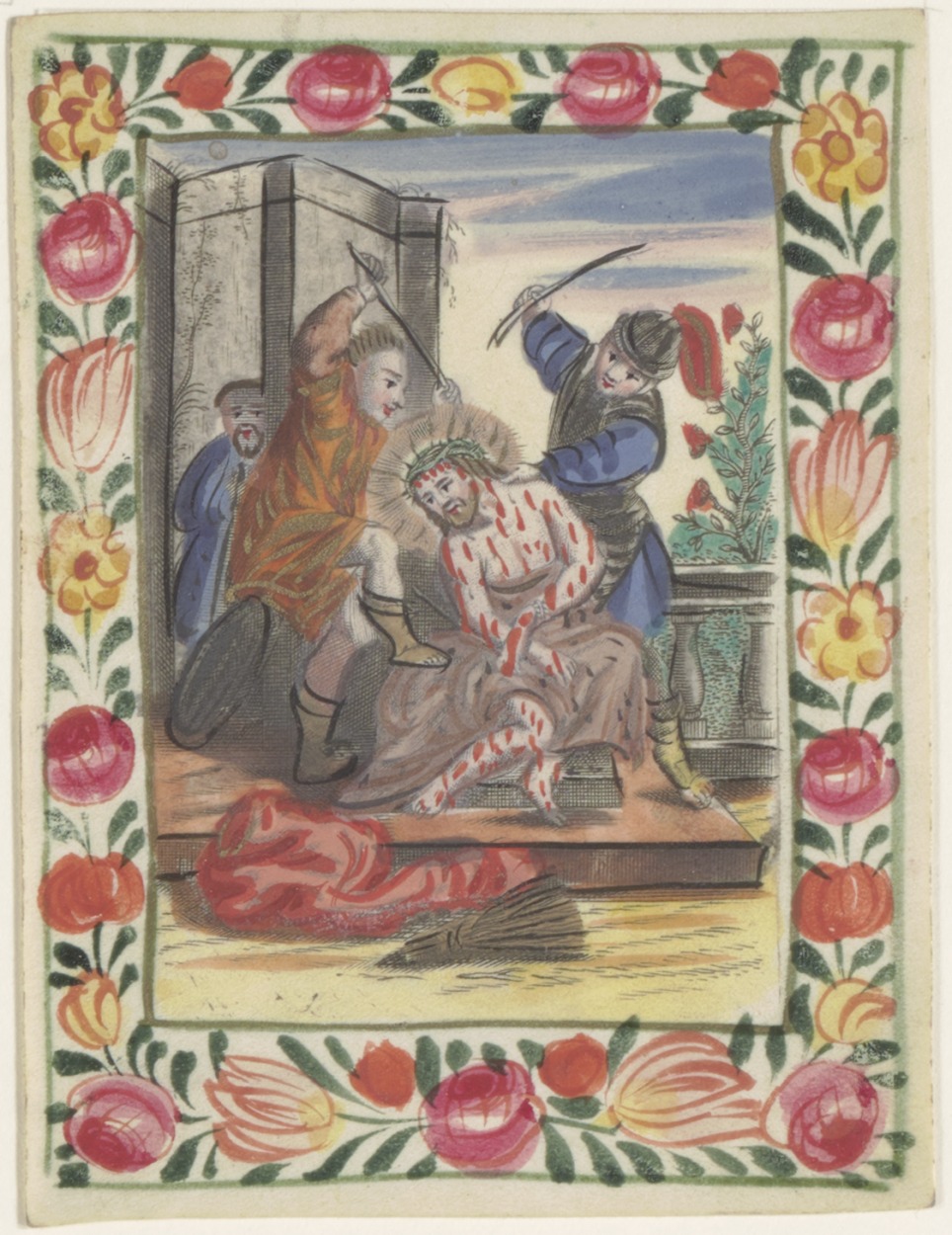 Marteling van Christus met martelwerktuigen, ingekleurd, kz. religieus (?);Bonaven;1715