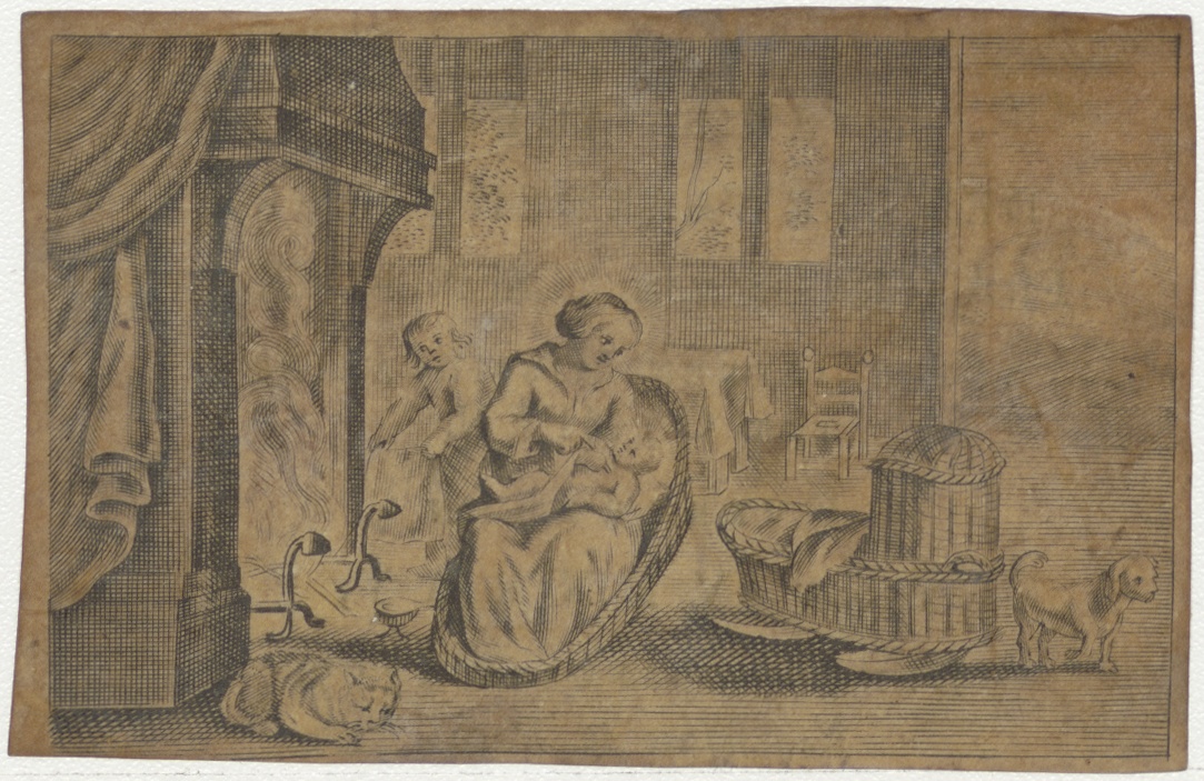 Maria met Christuskind, huiselijke scène, kz. Religieus; bid voor ziel Franciscus van Elsenbroek (+1767) missionaris tot Campen, Venray