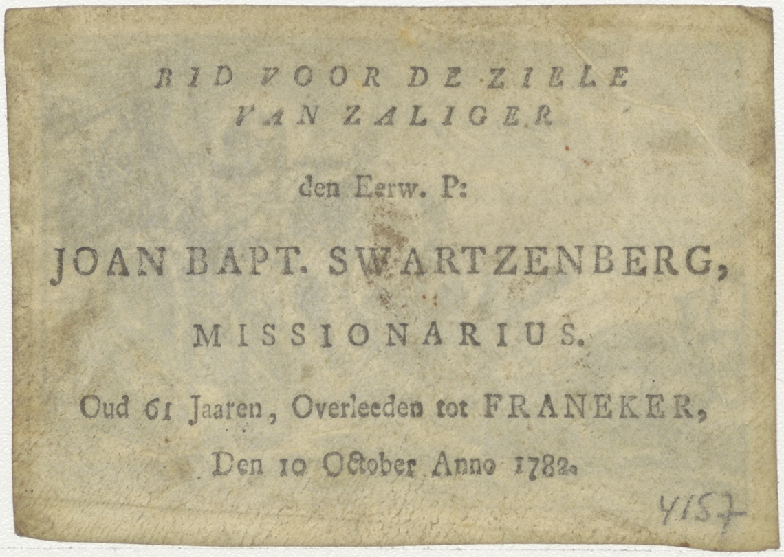 Christuskind op triomfwagen, kz. Religieus; bid voor ziel Joannes Swartzenberg (+1782) missionaris, Franeker