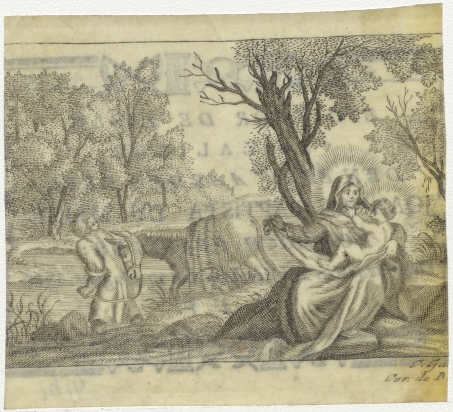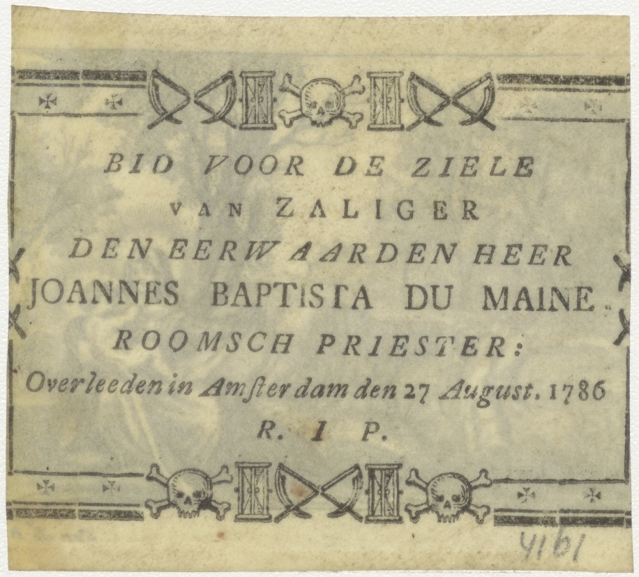 Rust op vlucht naar Egypte, kz. Religieus; bid voor ziel Joannes de Maine (+1786) pastoor te Amsterdam