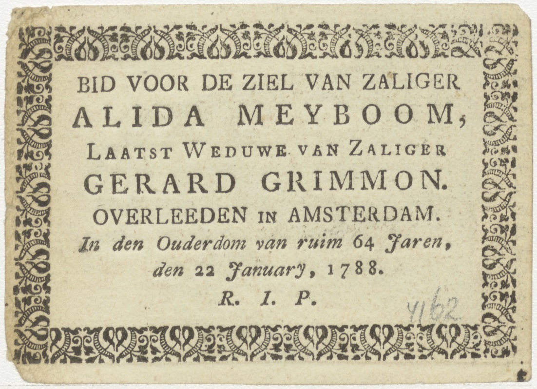 H. Willibrordus, kz. Bid voor ziel; Alida Meyboom-Grimmon (+1788) Amsterdam