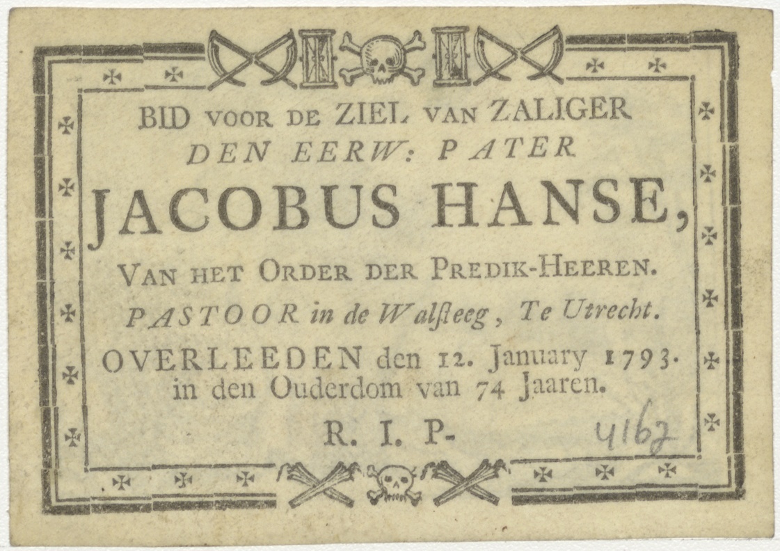 Maria met Christuskind en Johannes, kz. Religieus; bid voor ziel Jacobus Hanse (+1793) pastoor Walsteeg Utrecht