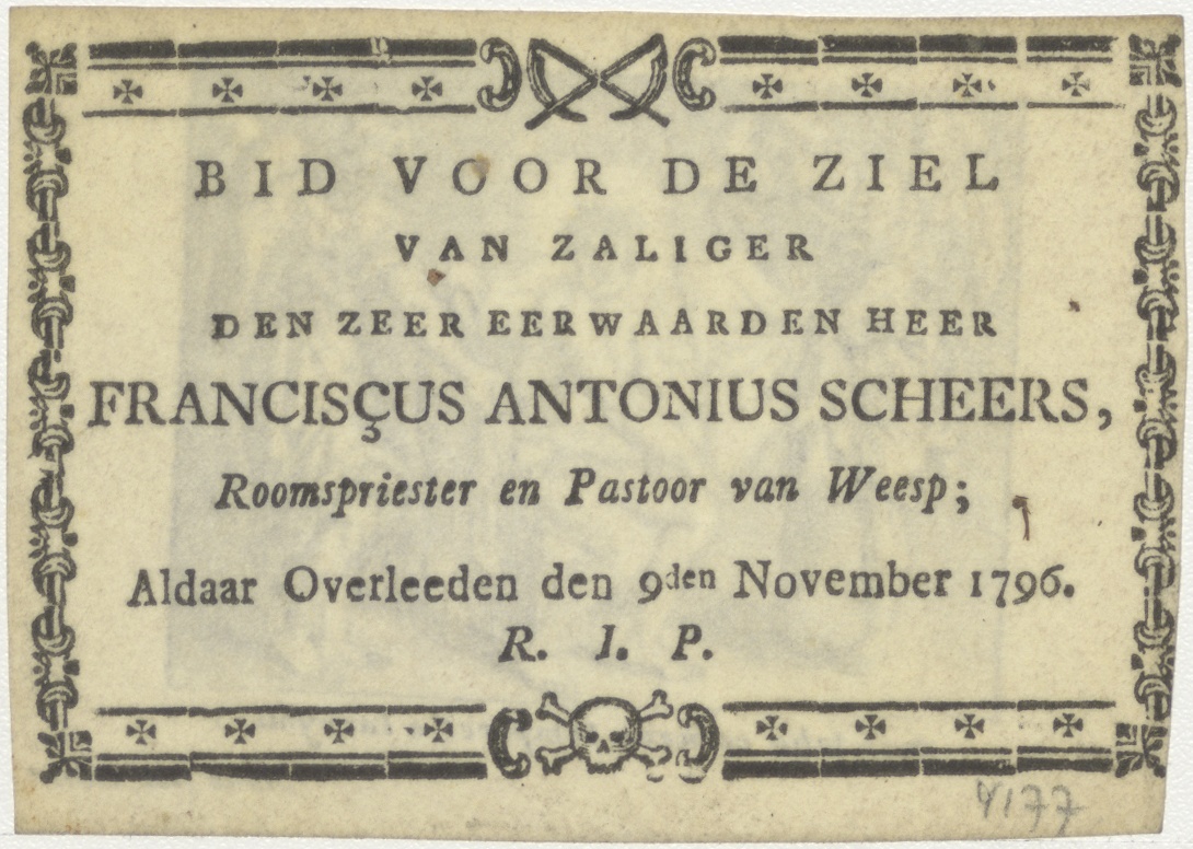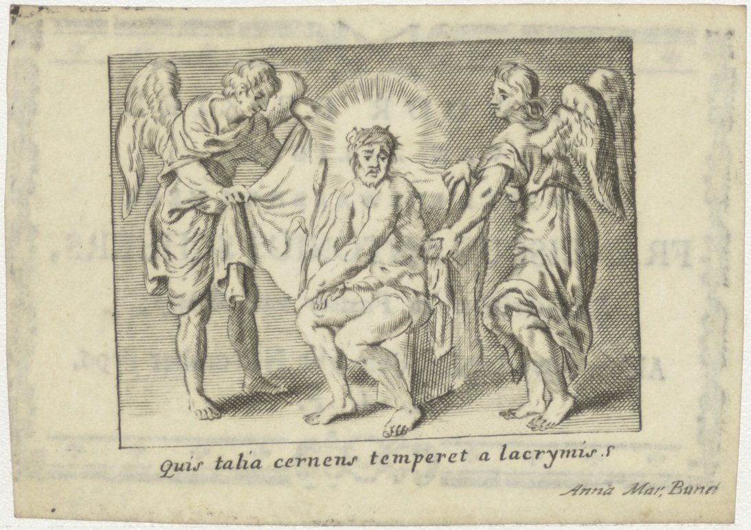 Gemartelde Christus met twee engelen, kz. Religieus; bid voor ziel Franciscus Scheers (+1796) pastoor van Weesp