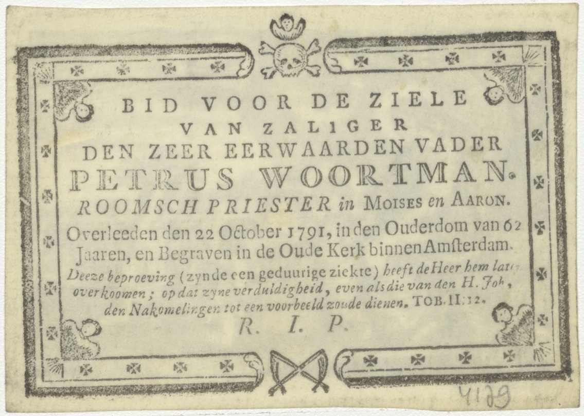 Maria met Christuskind, kz. Bid voor ziel Petrus Woortman (+1791) pastoor Mozes en Aaron , Amsterdam