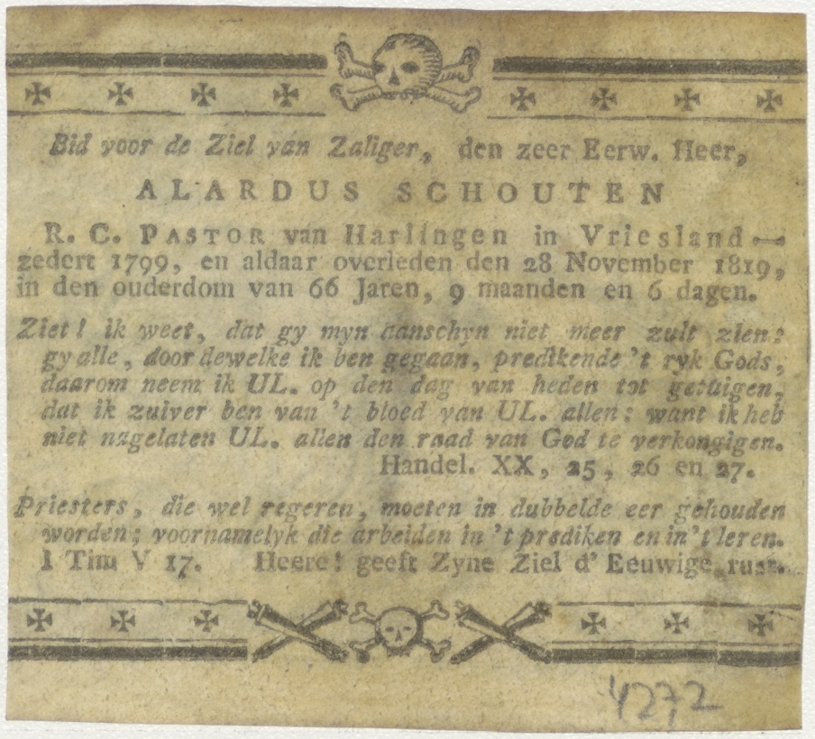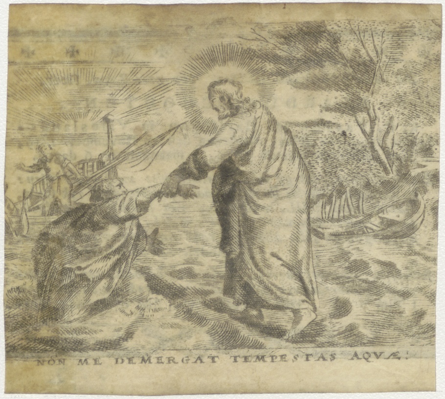 Christus redt Petrus uit het meer van Galilea, kz. Religieus; bid voor ziel Alardus Schouten (+1819) pastoor van Harlingen