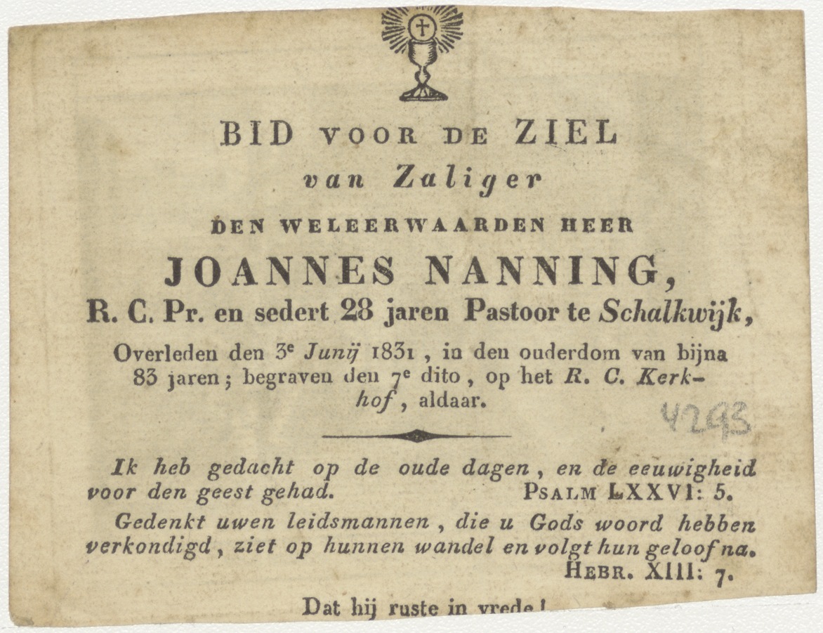 Wonder van Christus; blinde genezen, kz. Religieus; bid voor ziel Joannes Nanning (+1831) pastoor te Schalkwijk