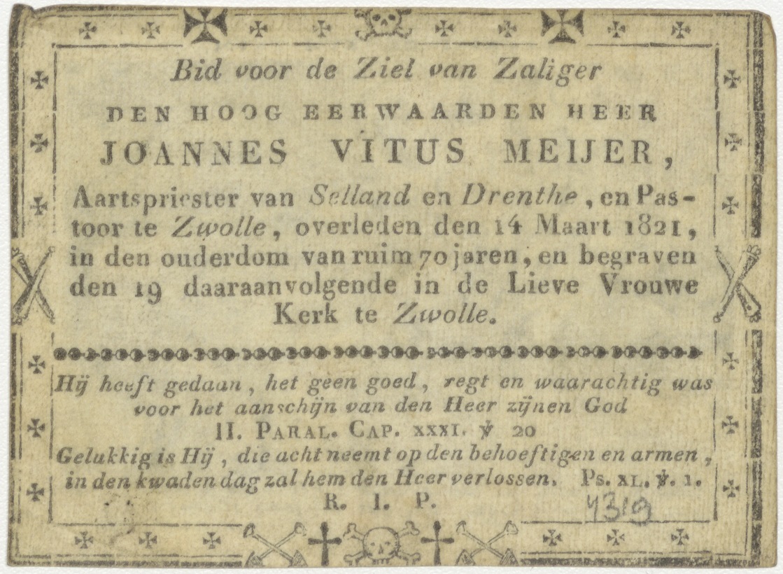 Onze Vader..., kz. Religieus; bid voor ziel Joannes Meyer (+1821) aartspriester van Salland en Drent, pastoor Zwolle