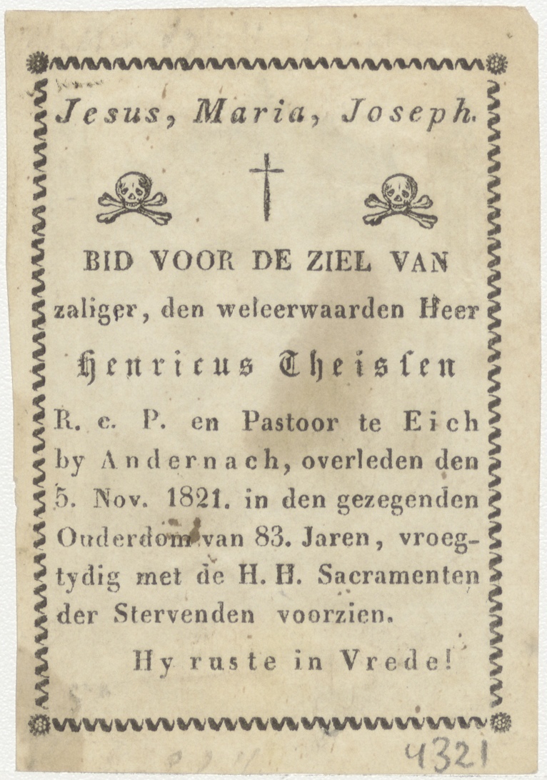 H. Hendricus, kz. Religieus; bid voor ziel Henricus Theisten (+1821) pastoor te Eich bij Andernach