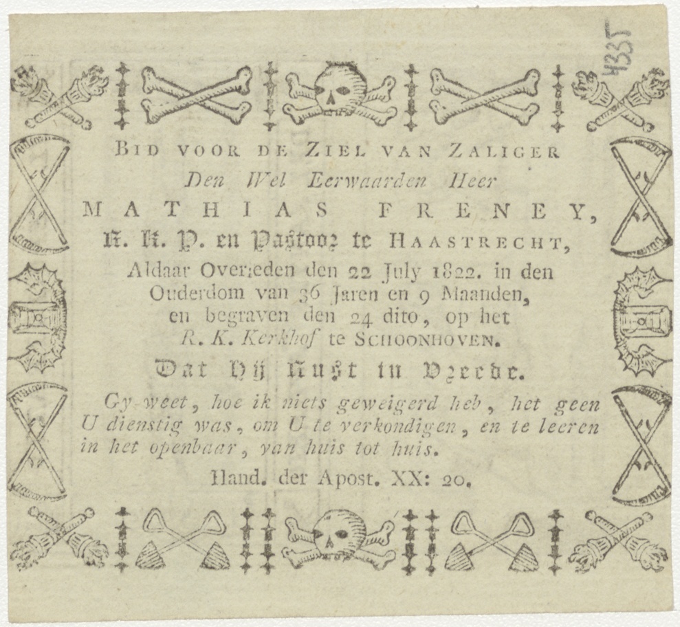 Veronicadoek van Christus, kz. Religieus; bid voor ziel Matthias Freney (+1822) pastoor te Haastrecht