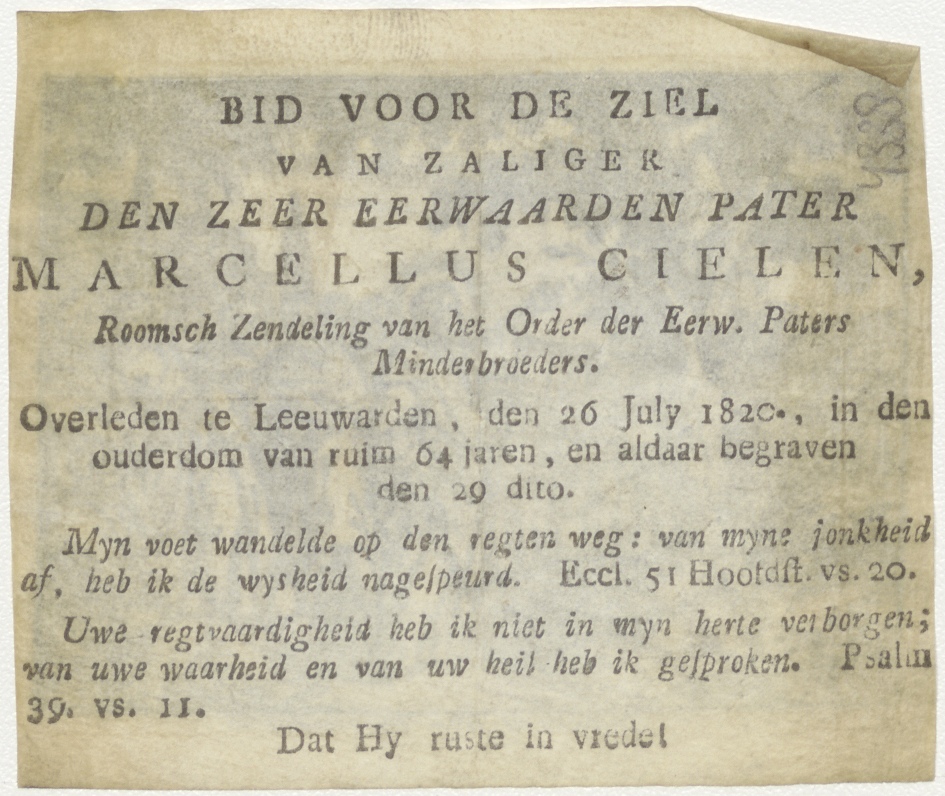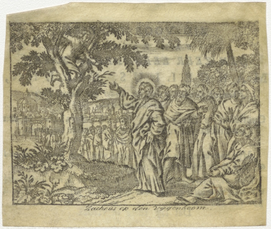 Zacheus in de vijgeboom met Christus, kz. Religieus; bid voor ziel Marcellus Ciel (+1820) minderbroeder Leeuwarden