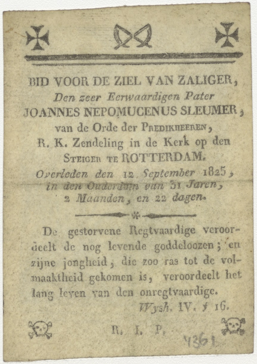 Oprichting van het kruis van Christus, kz. Religieus; bid voor ziel Johannes Sleumer (+1825) predikheer De Steiger Rotterdam