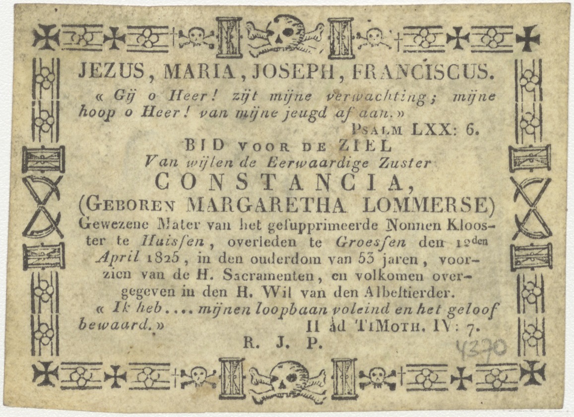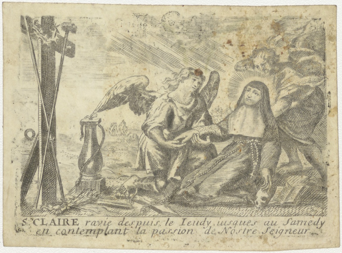 H. Clara knielend voor passiekruis, met twee engelen, kz. Religieus; bid voor ziel Lommerse (+1825) zuster Constantia Mater, klooster Huissen