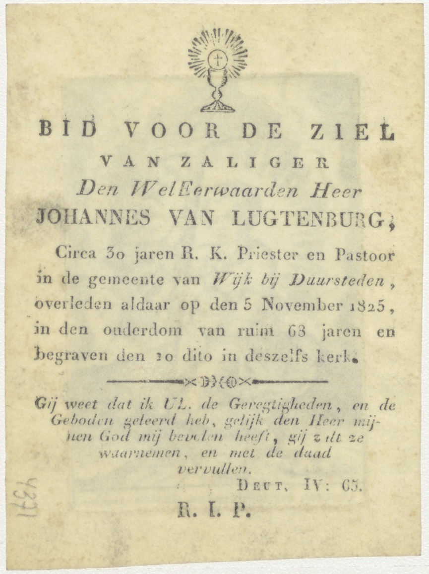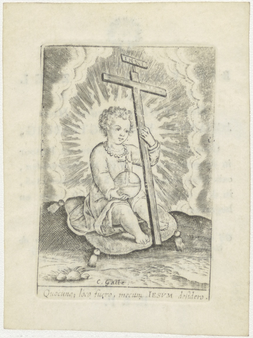Christuskind als Salvator Mundi zittend op kussen, met kruis in linkerhand en wereldbol in rechterhand, kz. Religieus; bid voor ziel Johannes van Lugtenburg (+1825) Wijk bij Duurstede