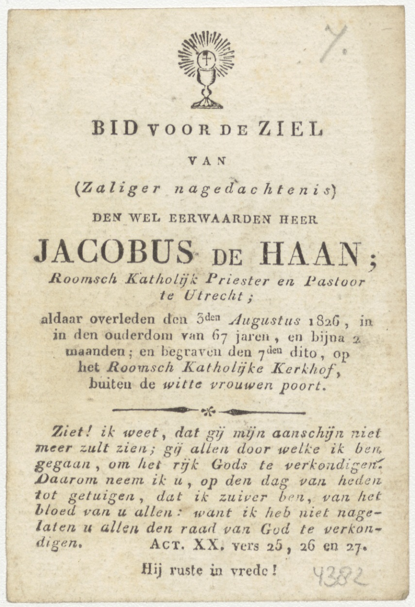 H. Adelaide (Frans), kz. Religieus; bid voor ziel Jacobus de Haan (+1826) pastoor te Utrecht