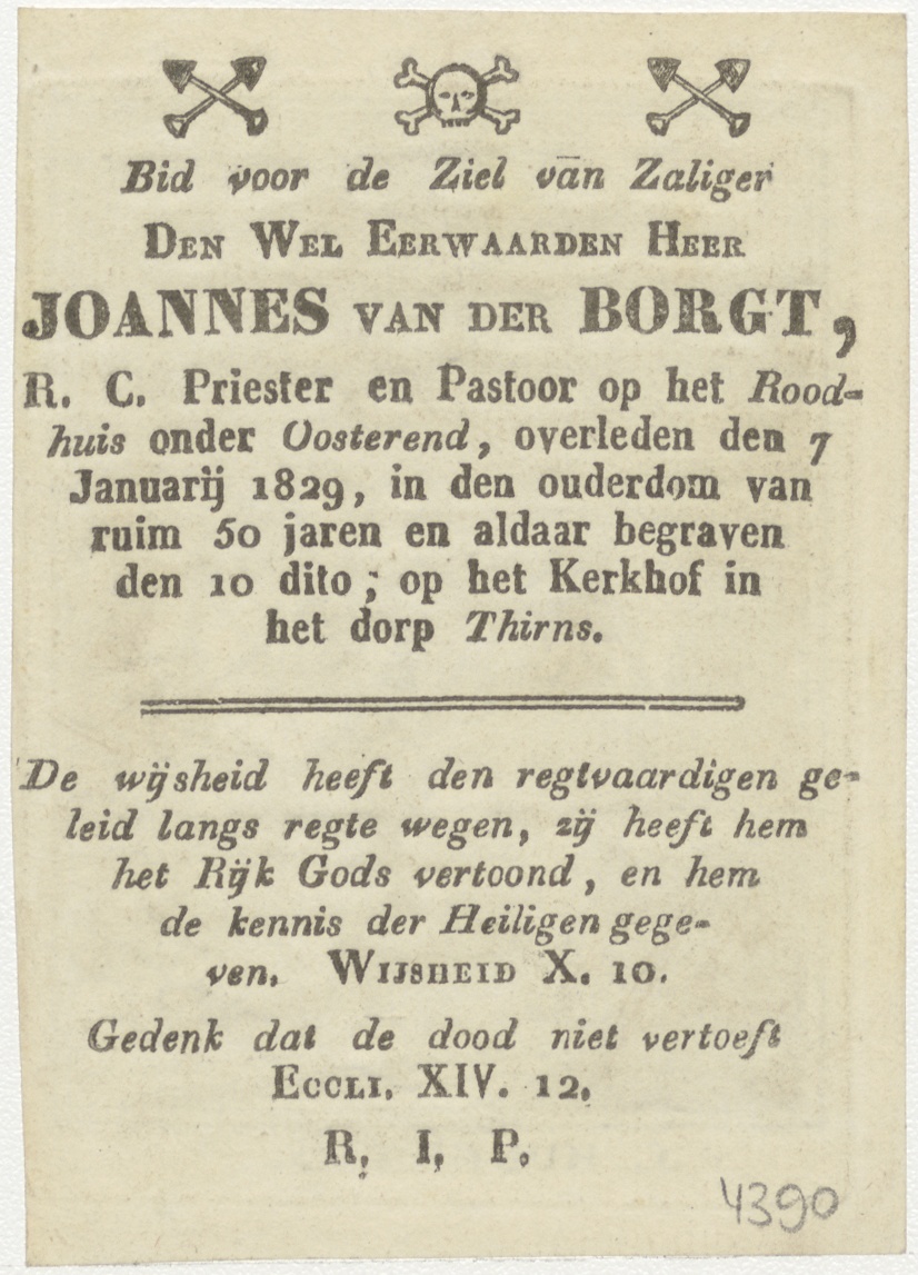 H. Hubertus, kz. Religieus; bid voor ziel Joannes van der Borgt (+1829) pastoor Roodhuis onder Oosterend