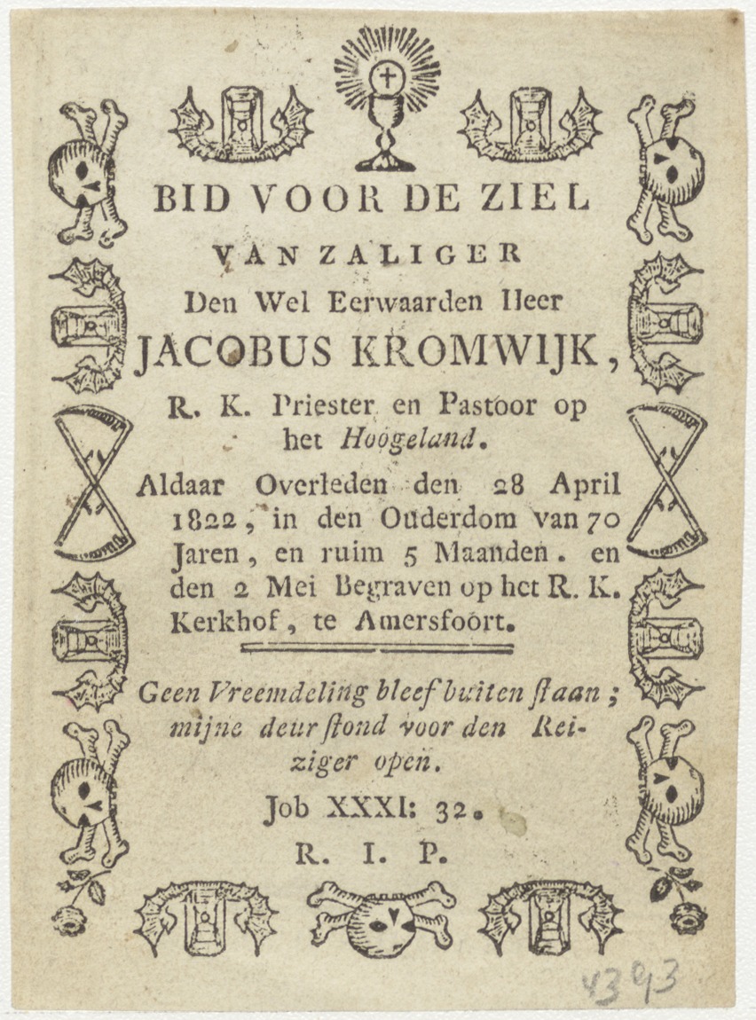 H. Franciscus van Assisi (Frans), kz. Religieus; bid voor ziel Jacobus Kromwijk (+1822) pastoor op Hoogland