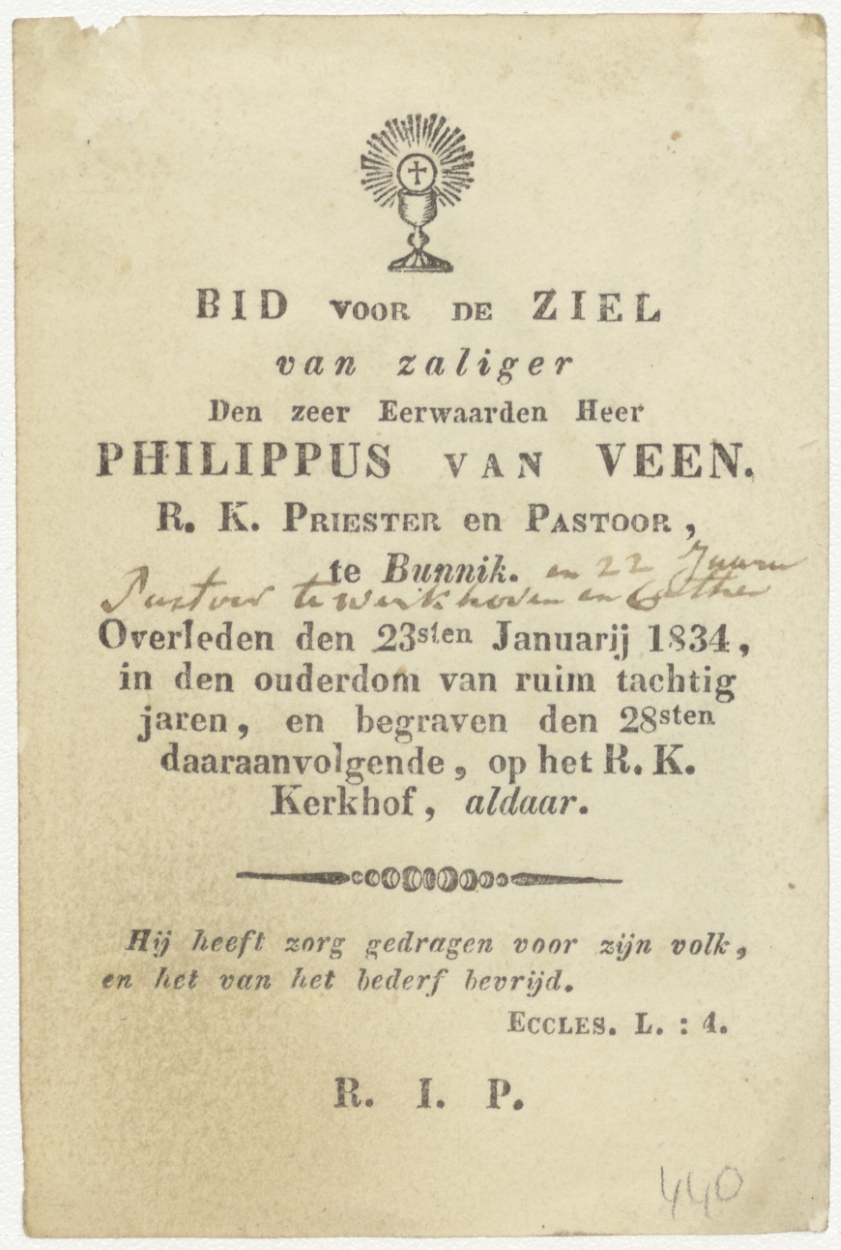 H. Wunibaldus, abt, kz. Religieus;Bid voor ziel Van Veen (+1834);pastoor te Bunnik