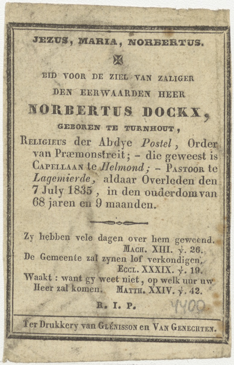 H. Guilielmus, kz. Religieus; bid voor ziel Norbertus Dockx (+1835) Norbertijn, pastoor te Lagemierde