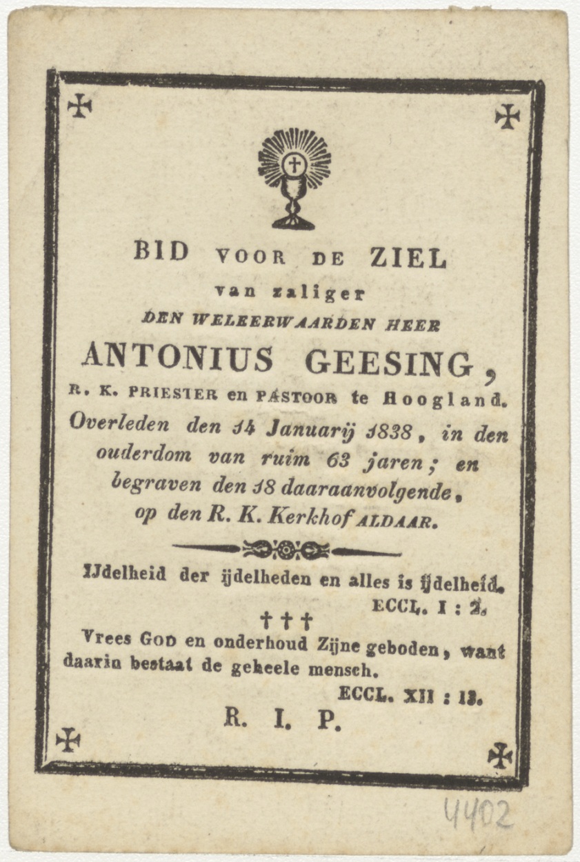 H. Anthonius van Padua, kz. Religieus; bid voor ziel Antonius Geesing (+1838) pastoor te Hoogland