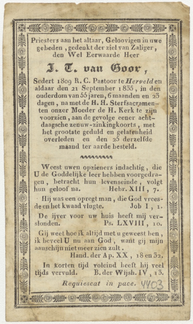 Stervelingen... kruis met alziend oog, kz. Religieus; bid voor ziel J.C. van Toor (+1835) pastoor te Herveld
