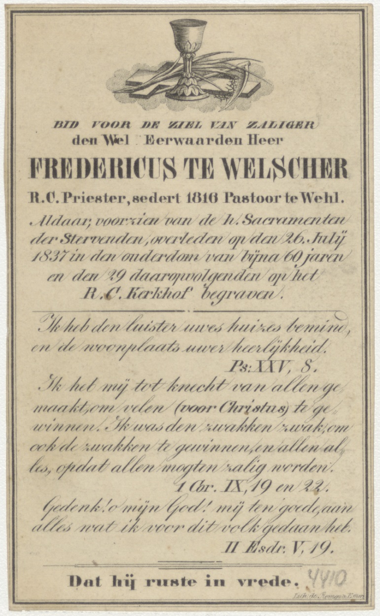 Maria, ontbevlekt ontvangen, kz. Religieus; bid voor ziel Fredericus te Welscher (+1816) pastoor te Well