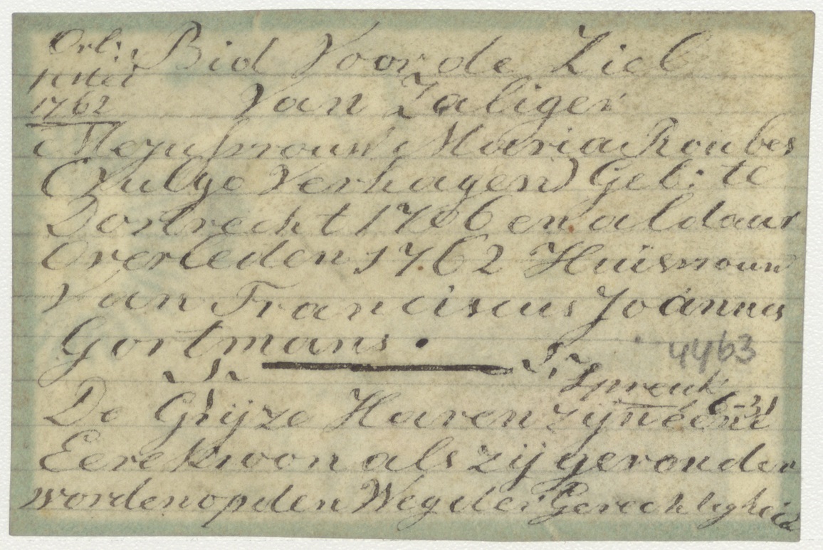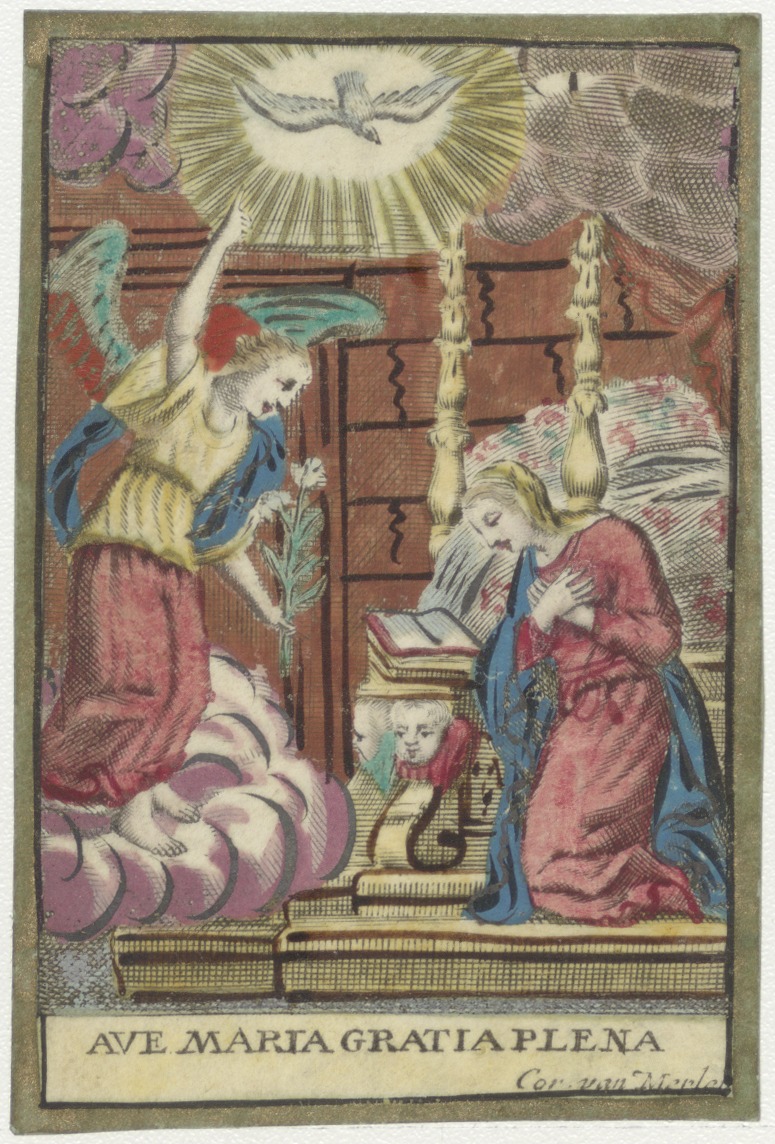 Annunciatie, ingekleurd, kz. Bid voor ziel Roubes-Verhagen (+1762) Dordrecht