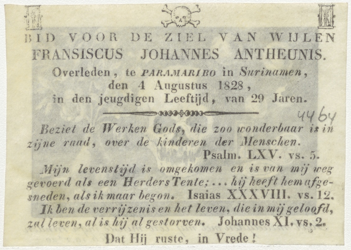 Vanitas met schedel, kz. Bid voor ziel Antheunis (+1828) Paramaribo