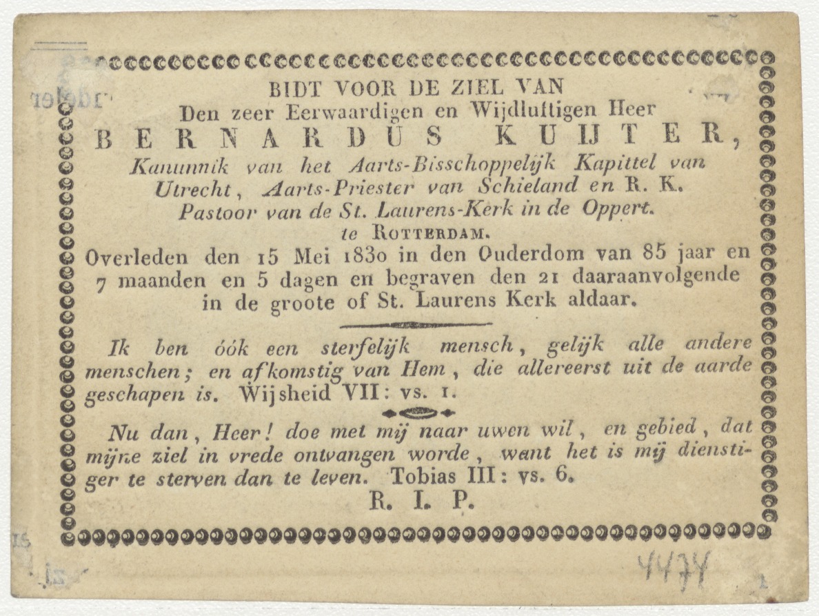 Kroning van Maria, ingekleurd, kz. Religieus; bid voor ziel Bernardus Kuijter (+1830) kanunnik Utrecht, pastoor St. Laurens Rotterdam