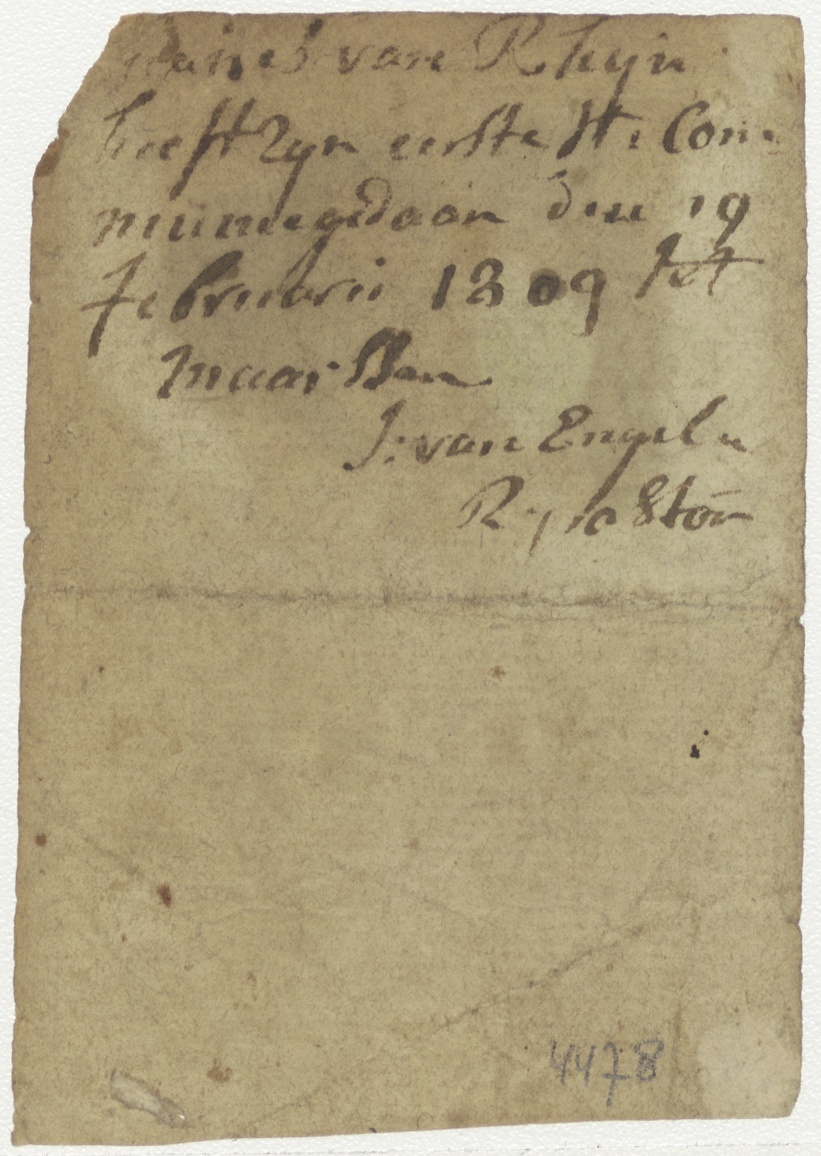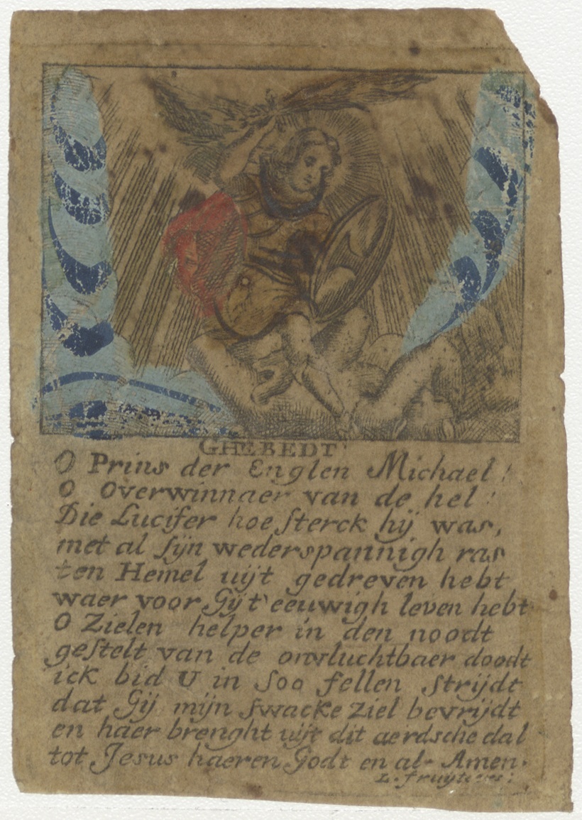H. Michael met gebed, ingekleurd, kz. H. Communie van Rhijn 1809 door pastoor J. van Engel