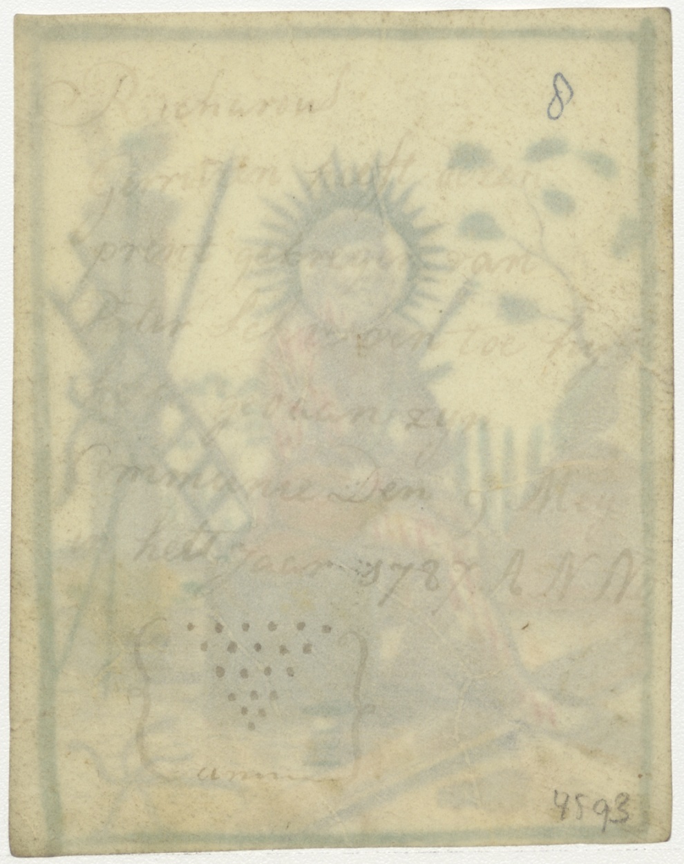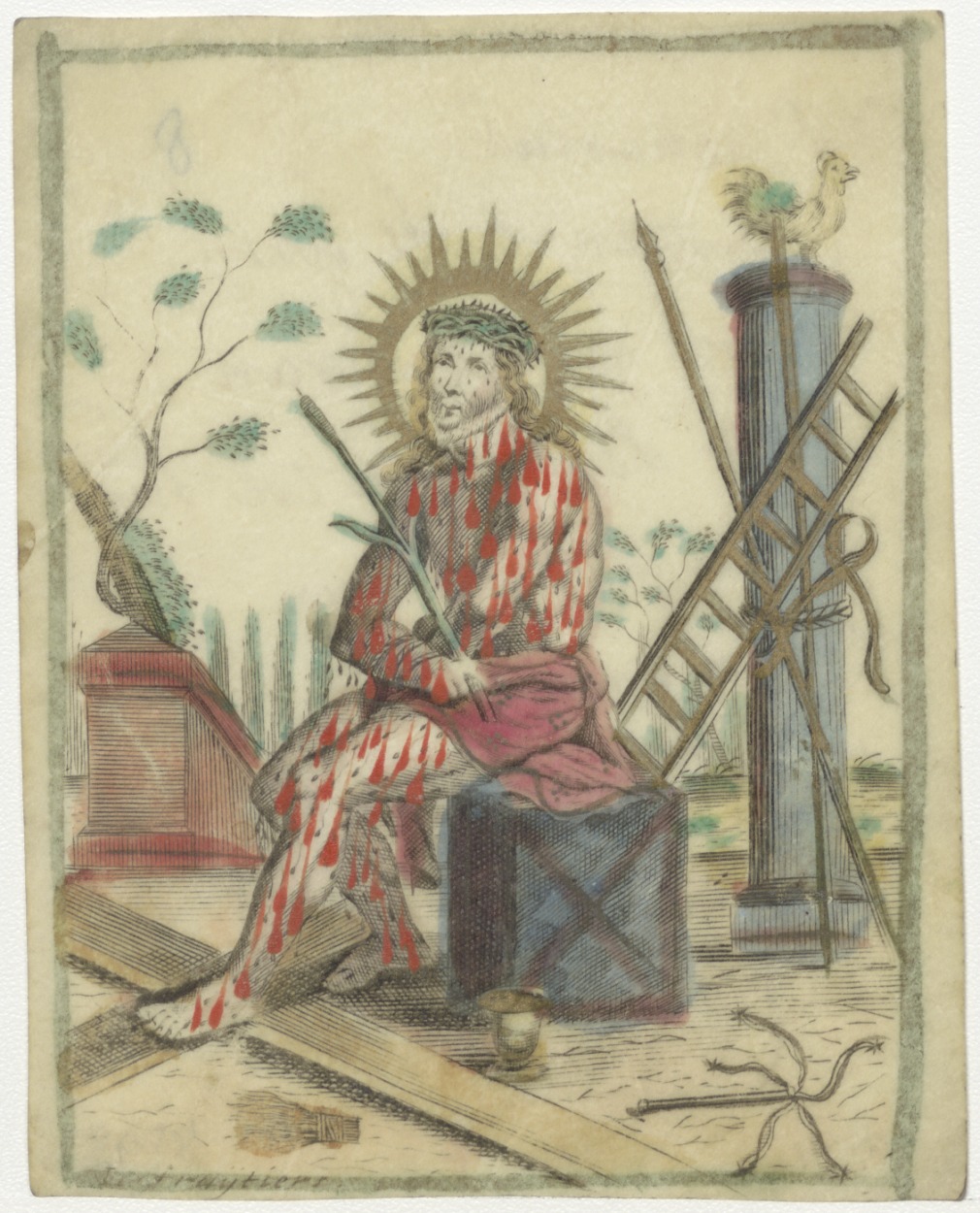 Lijdende Christus met martelwerktuigen, ingekleurd, kz. H. Communie Richardus Gerritsen 1787