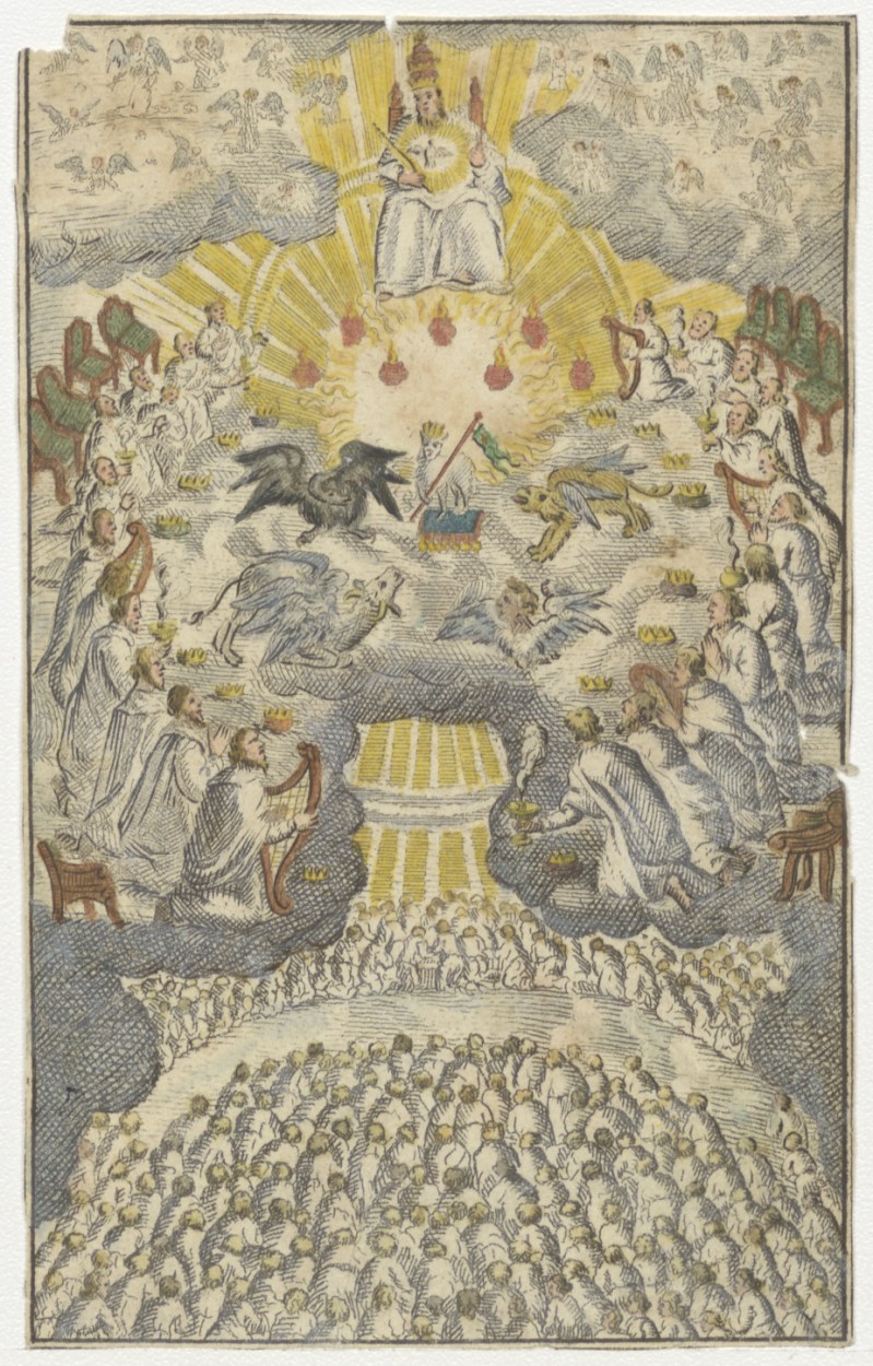 Laatste oordeel mer God, evangelisten en heiligen in de hemel, ingekleurd