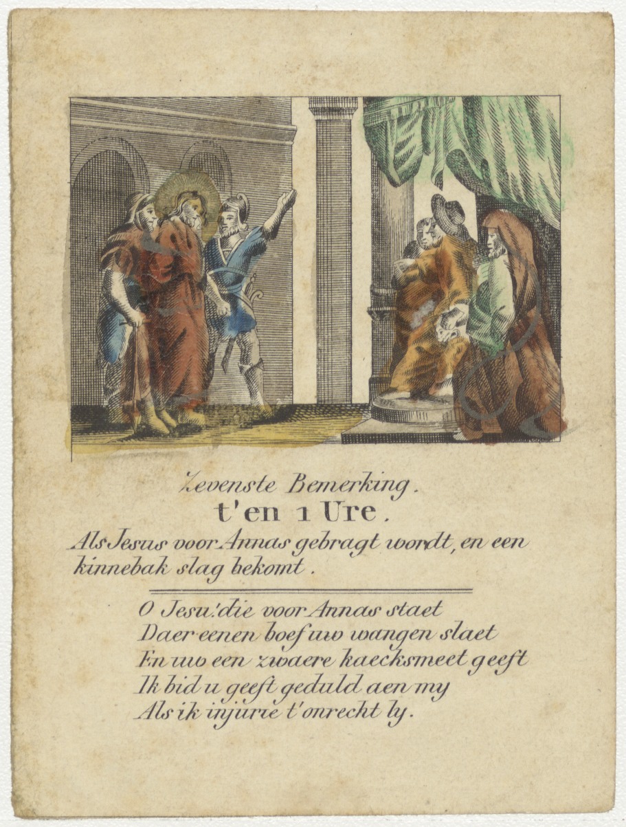 Passie (serie): zeven, Christus voor Annas, met gebed, ingekleurd
