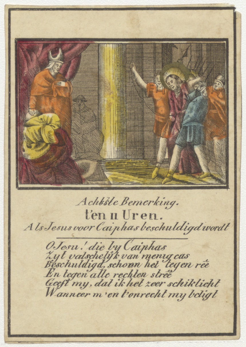 Passie (serie): acht, Christus voor Caiphas, met gebed, ingekleurd