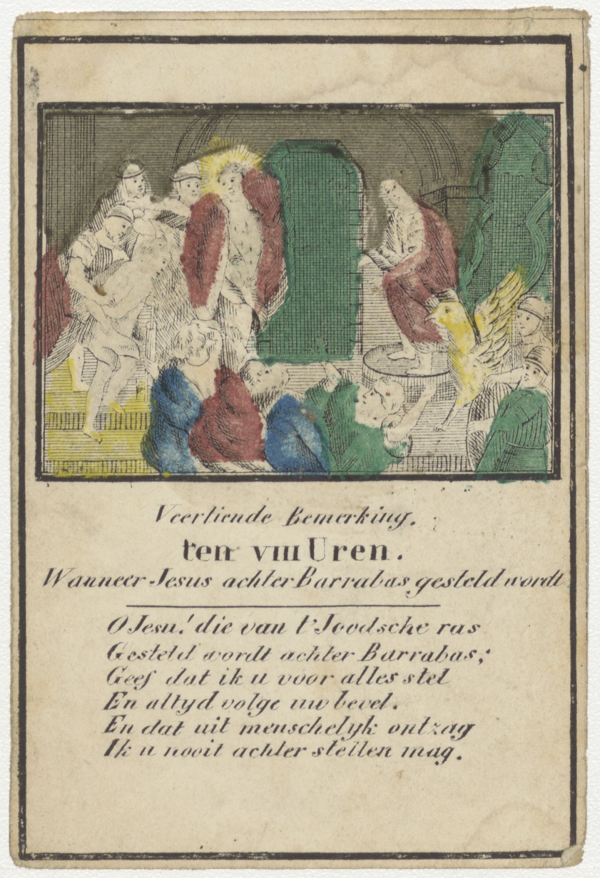 Passie (serie): veertien, Christus achter Barrabas, met gebed, ingekleurd